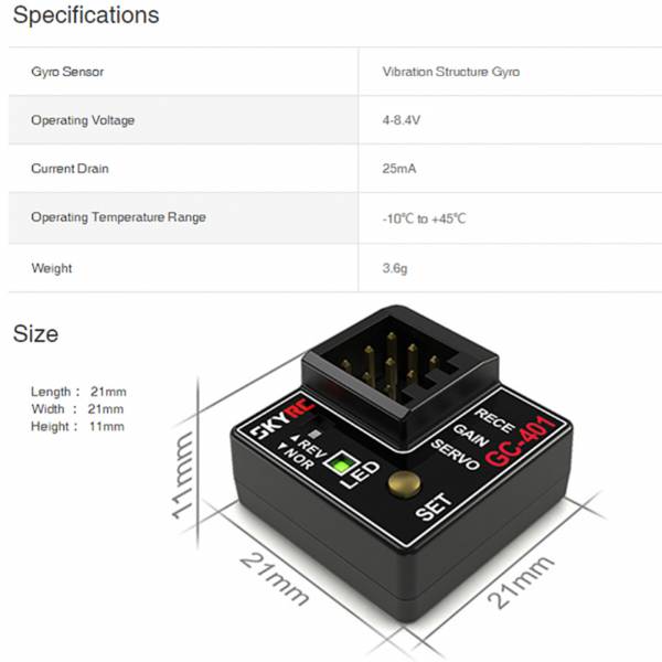 SKYRC (#SK-600142-2) GC401 Gyro - гироскоп для RC автомодели. Это устройство обеспечивает более маневренное и контролируемое вождение при езде на высоких скоростях.