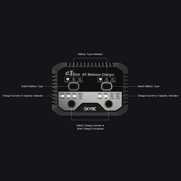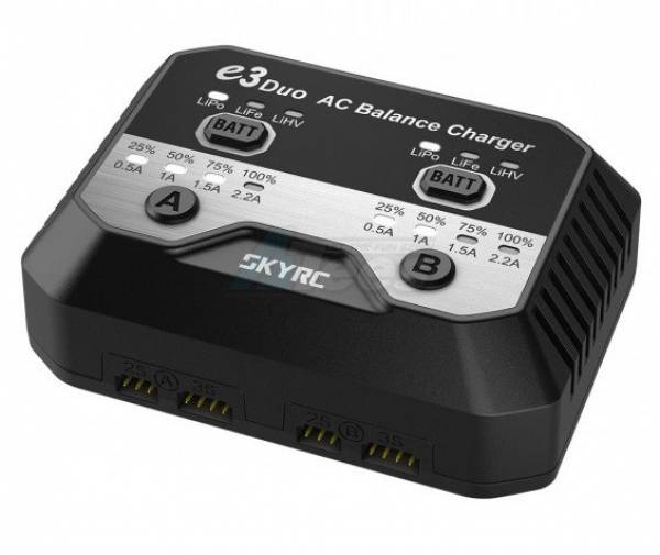 e3 Duo готов к зарядке 2-3-элементных аккумуляторов LiPo, LiFe и LiHV в режиме баланса по отдельным каналам мощностью по 20 Вт каждый, а максимальный ток заряда может достигать 2,2 А. Четыре вида зарядного тока 0,5 А/1A /1,5 А/2,2 А обеспечивают гибкость для аккумуляторов различной емкости.