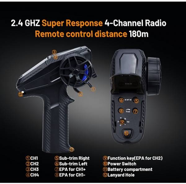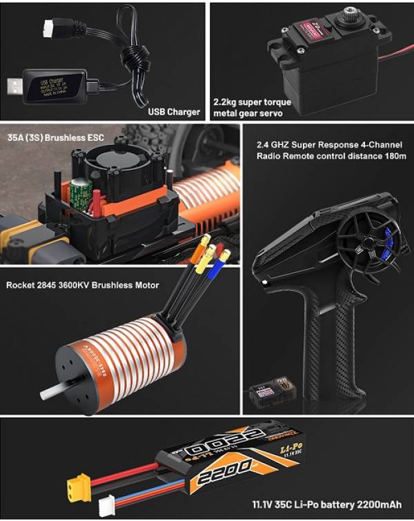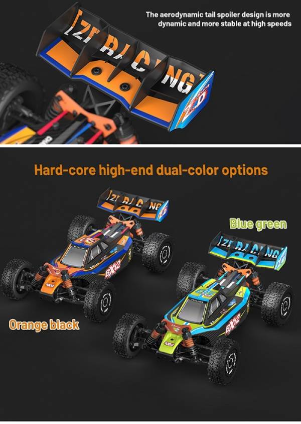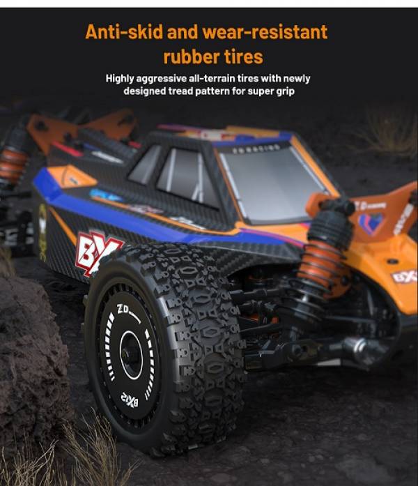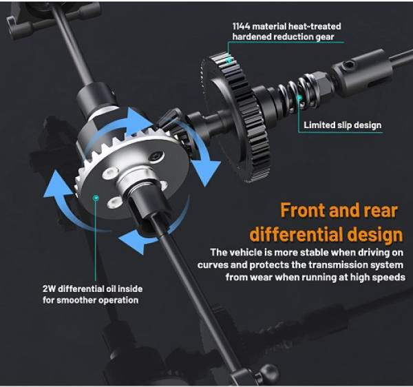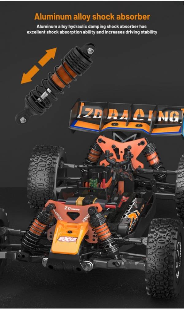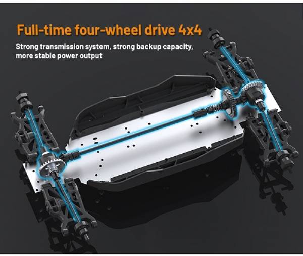 Шасси из алюминиевого сплава, передняя и задняя поперечные верхняя и нижняя двухслойные опоры, значительно улучшающие конструкцию кузова. Конфигурация узких передних и широких задних гоночных шин повышенной проходимости, оснащенных спойлером, обеспечивает более плавную скорость. Весь автомобиль оснащен высокоточными подшипниками, обеспечивающими плавный ход. Агрессивные шины повышенной проходимости, протектор из натурального каучука, новый дизайн рисунка протектора с превосходным сцеплением, которые позволяют легко передвигаться по любой местности. Прочная система подвески с передними и задними стабилизаторами поперечной устойчивости, которая значительно улучшает управляемость автомобиля в целом.