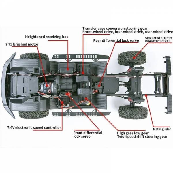 - CH1: Рулевое управление; CH2: Дроссельная заслонка; CH3: Освещение; CH4: Высокая/низкая скорость; CH7: Передний/полный/задний привод; CH9: Передний дифференциал; CH10: Задний дифференциал; CH5-6-8: Настройка каналов (можно изменить по своему усмотрению).