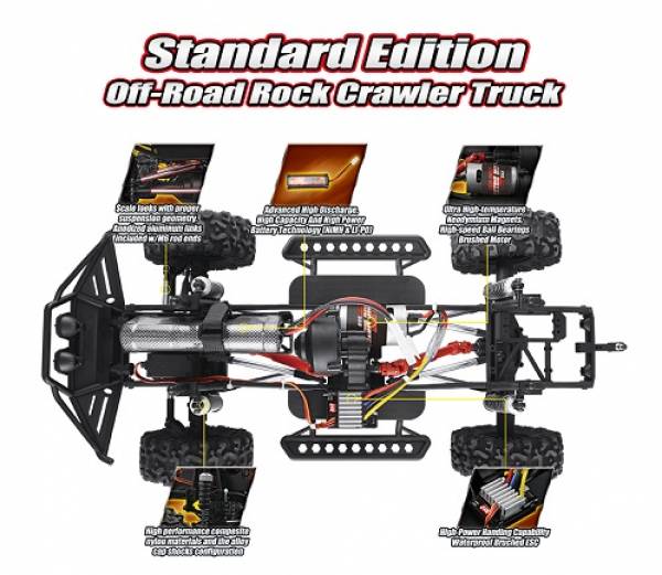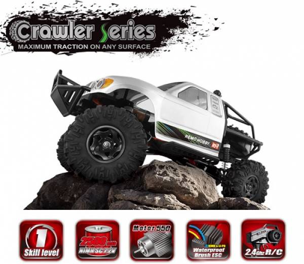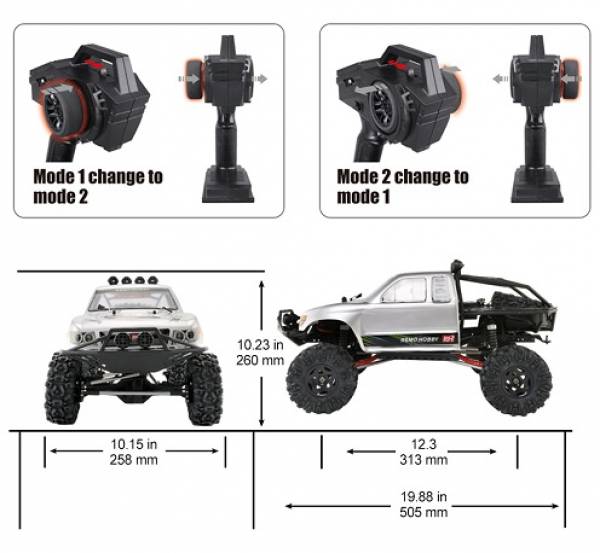 RemoHobby (#1093-ST) 1/10 Scale Electric 4WD 2.4GHZ RC Off-Road Brushed Rock Crawler Jeeps 4WD - полноприводный внедорожник, выполнен в масштабе 1/10. Данная модель предназначена для неспешного преодоления серьезных препятствий. Модель MOUNTAIN LION 4WS оснащена мощным коллекторным электродвигателем и влагозащищенной электроникой. Специально разработанные высокопрофильные шины из мягкой резины и специальные колесные диски позволят чувствовать себя уверенно на серьёзных неровностях и высоких препятствиях. Особенностью данной модели является наличие двух рулевых сервоприводов на каждый мост по отдельности 4WS.
