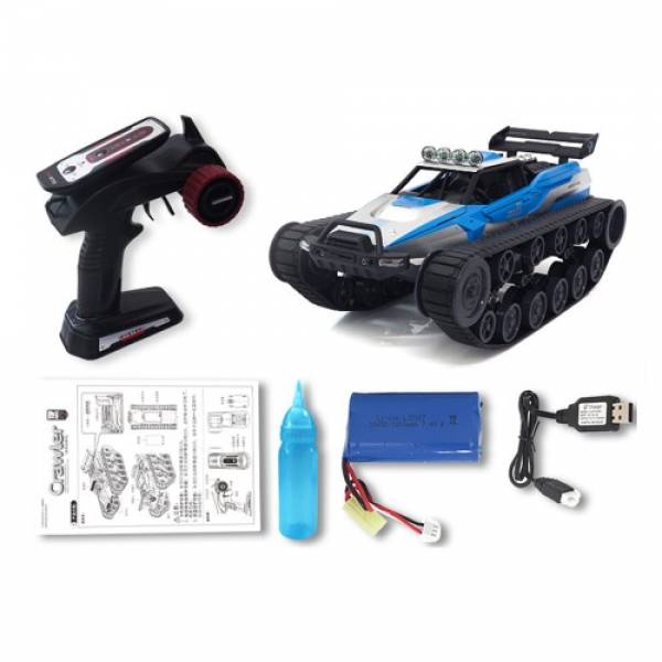 Гусеничный вездеход амфибия способен преодолевать пересечённую местность там, где не проедет не один полноприводный автомобиль. Оснащен амортизаторами и поэтому вездеход плавно преодолевает любого рода насыпи из камней, палок и так далее. Оснащен усиленной рамой, что придает прочности всей конструкции, кабина выполнена в очень высокой детализации, вы можете открыть двери и заглянуть в кабину. Несмотря на то что данная машинка игрушка является практически танком, она имеет достаточно высокую скорость и разгоняется до 12 км/ч. На вездеход установлен емкий аккумулятор на 1200 mah, а время игры составят более 20 минут. Пульт управления 2.4 ГГц имеет дальность управления машины до 100 м. В зависимости от типа дорожной поверхности Вы можете регулировать натяжение гусениц для большей проходимости, максимальный угол подъема составляет 30 градусов.