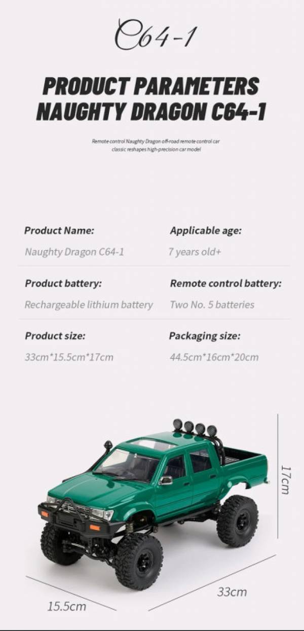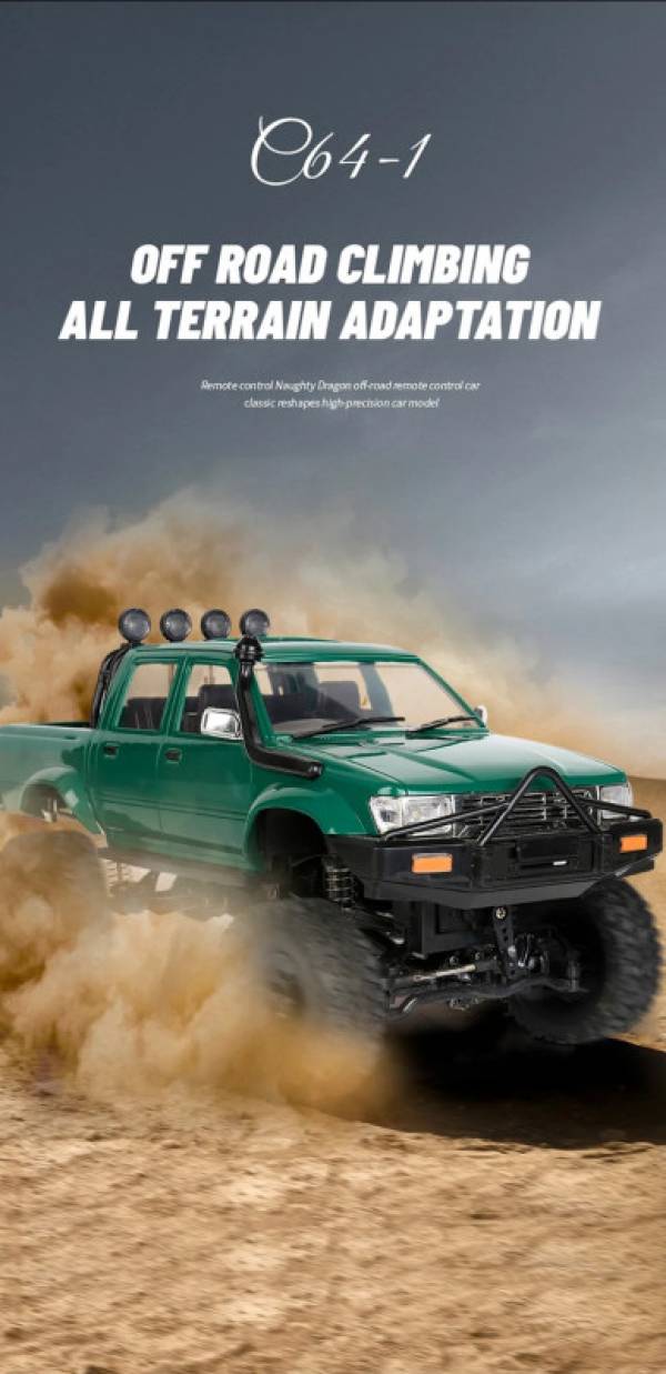 Радиоуправляемый пикап WPL C-64-1 Hilux Crew 4WD 1/16 - WPLC-64-1 - это пикап на пульте управления, копия настоящего автомобиля Hilux Crew от компании WPL в масштабе 1/16. Машинка оснащена коллекторным двигателем. Полный привод с мягкими, но прочными противоскользящими шинами обеспечивают пикапу высокую проходимость в условиях бездорожья.