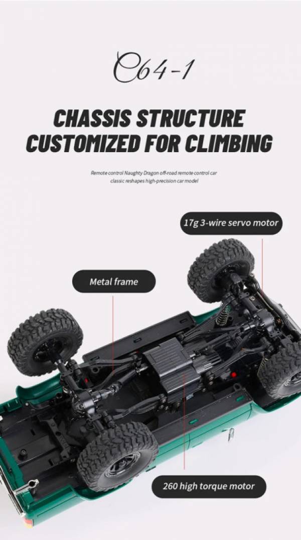 Прекрасная детализация позволяет разглядеть часть салона через стекла. Машина не испугается даже крутых склонов под углом до 35°, поскольку шины обеспечивают хорошее сцепление. Полного заряда аккумулятора 800 mAh хватит на 20-30 минут запуска машинки на дистанции до 50 м. Управление осуществляется при помощи идущего в комплекте пульта 2.4GHz.