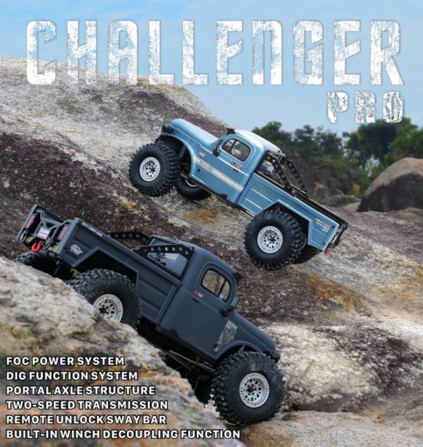 С момента запуска RGT Challenger в конце 2022 года, он завоевал признание рынка благодаря своей мощной конфигурации и превосходным характеристикам. Для дальнейшего улучшения и повышения производительности Challenger, RGT выпускает полностью модернизированную версию, отвечающую требованиям рынка. Модернизированный Challenger оснащен бесщеточной системой FOC Hobbywing (WP Fusion BLSYS для Crawler-540 SPEC-RTR), приводимой в движение магнитным управлением ориентацией, обладающей высоким крутящим моментом на низких оборотах и отличной линейностью. Двигатель работает плавно и бесшумно, имеет превосходную водонепроницаемость и пылезащиту, легко справляясь с любыми климатическими условиями и типами местности. Выход BEC 7,4 В/3А обеспечивает больший крутящий момент для высоковольтного сервопривода. Модернизированная версия призвана сделать всю модель более легкой, используя нейлоновый портальный мост и спиральную главную шестерню. Версия PRO сохраняет двухступенчатую трансмиссию, трансмиссию DIG, режимы переднего и полного привода, а также заднюю лебедку, и добавляет электрическое отключение заднего стабилизатора поперечной устойчивости. Все пять сервоприводов оснащены металлическими шестернями, а рулевой сервопривод заменен на 35-килограммовый стальной сервопривод с ЧПУ-обработкой. Латунная передняя крышка крепления рулевого управления устанавливается на заводе, что увеличивает неподрессоренную массу и улучшает максимальную проходимость. Установлены амортизаторы большего диаметра из металла, а ось амортизатора обработана нанотитановым покрытием, что улучшает плавность хода амортизатора и обеспечивает автомобилю лучшую устойчивость в движении. Challenger PRO продолжает использовать оригинальный дизайн, но добавляет кабину и прицеп, а также многоуровневую покраску кузова изнутри и снаружи, что лучше предотвращает отслаивание краски из-за трения. Установлены стойки каркаса безопасности внутри и снаружи кузова для повышения ударопрочности.