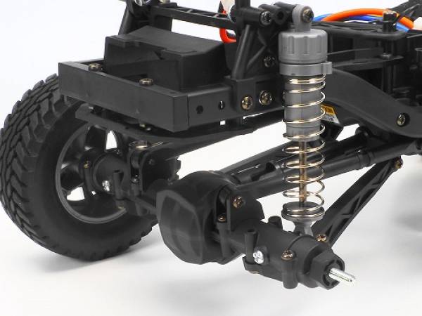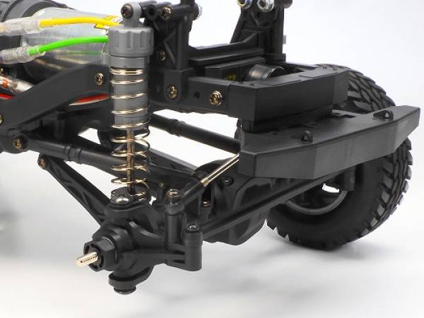 Рама шасси CC-02, разработанная для широкого спектра условий бездорожья, включая скалистую местность, вдохновлена полноразмерными транспортными средствами и является основой для его превосходной прочности. В системе 4WD двигатель расположен в продольном направлении за передней осью с раздельными коробкой передач и раздаточной коробкой, а карданные валы передают мощность на передний и задний дифференциалы . Спереди и сзади используется жесткая четырехрычажная подвеска с масляными амортизаторами CVA, обеспечивающими всесторонний контроль даже на сложных скальных участках. Эта модель поставляется с двенадцатиспицевыми дисками серебристого цвета и шинами с цепким рисунком блоков.