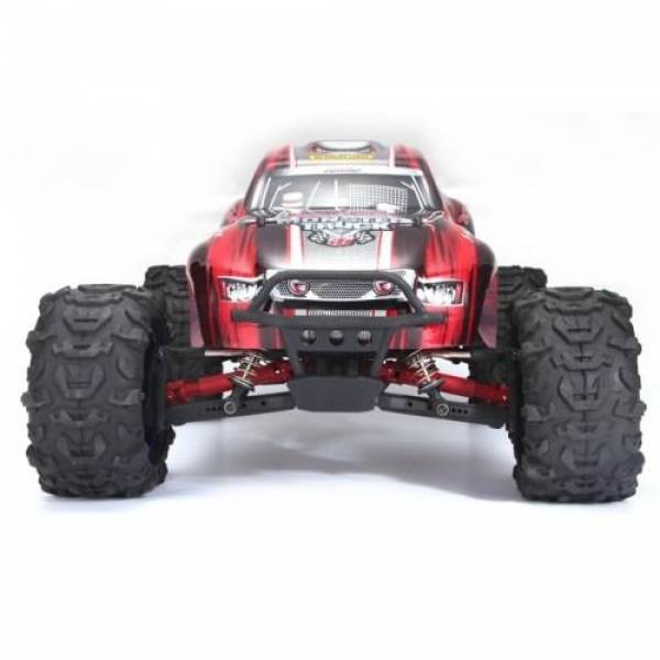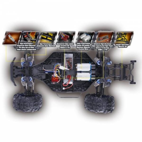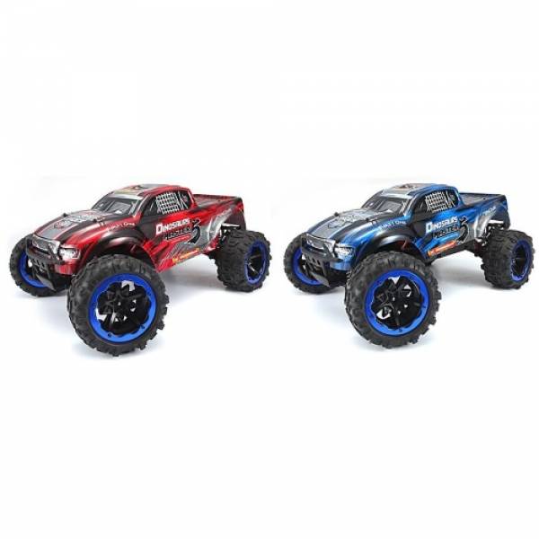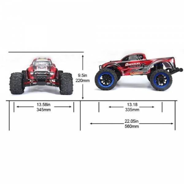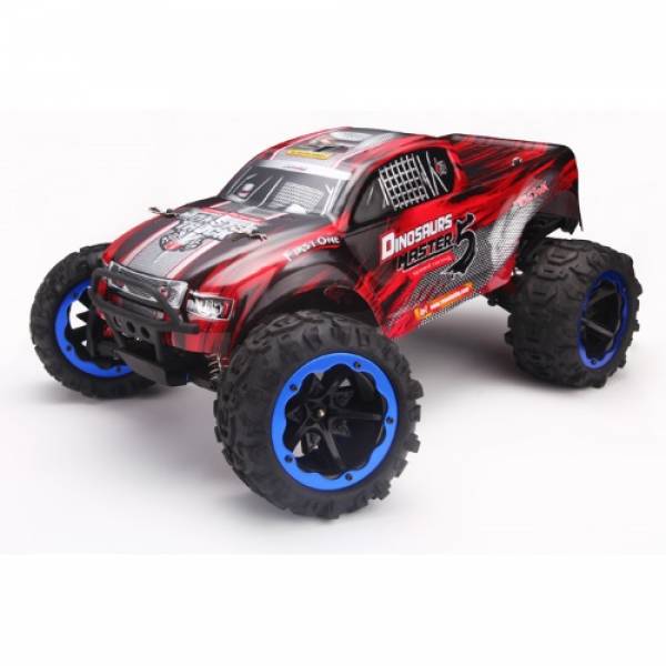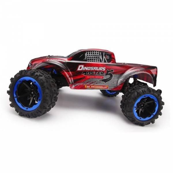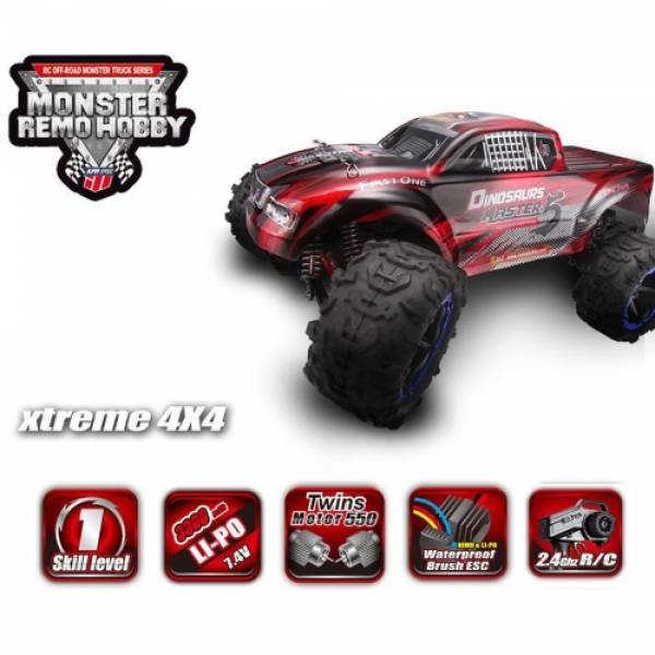 RemoHobby (#8032) 1/8-Scale Electric 4WD 2.4GHZ RC Off-Road Monster Truck Dinosaurs Master -полноприводный внедорожник, выполнен в масштабе 1/8, с коллекторным электродвигателем и аппаратурой управления с частотой 2.4GHz. Технические характеристики модели формируются мощным мотором и чувствительным регулятором ходовой части. Силовой агрегат позволяет машине создавать зрелищные эпизоды при быстром старте и резком торможении. Шасси из композитного нейлонового пластика с усиливающими элементами помогают модели вставать на колеса и сохранять работоспособность даже после серьезной аварии. Защиту от повреждений при лобовом столкновении обеспечивает бампер с демпферными элементами. Заниженный клиренс увеличивает степень управляемости монстра, внедорожные шины имеют хорошее сцепление с дорожным покрытием.