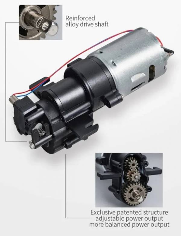 - Мотор 380 с двухступенчатой коробкой передач и металлическими шестернями;