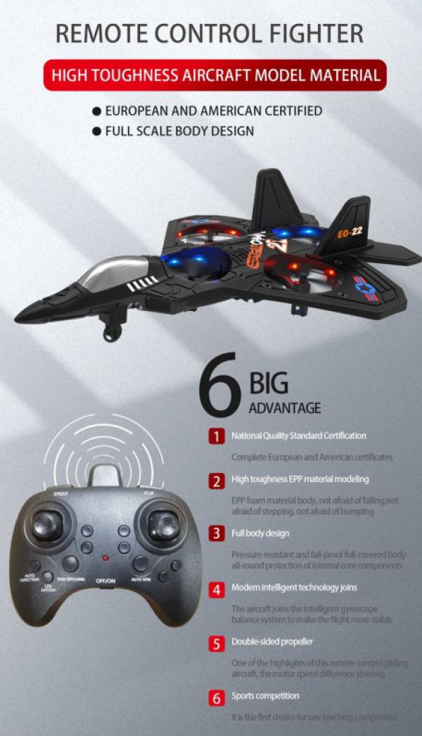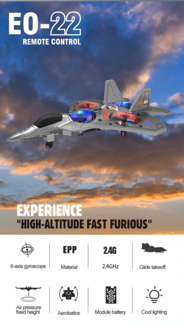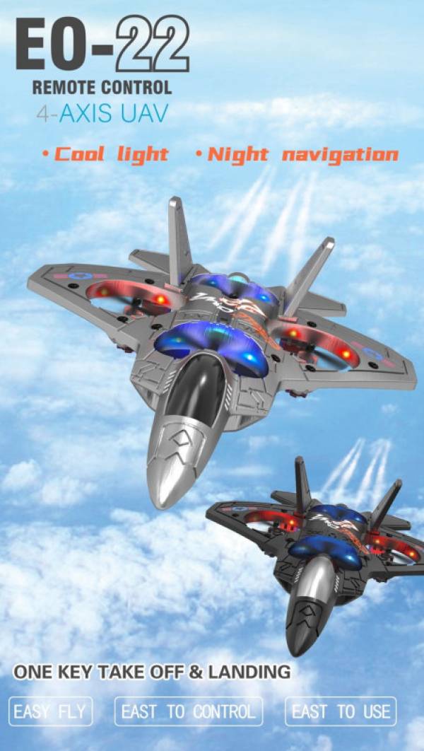 Радиоуправляемый дрон E0-22 представляет собой четырехосный беспилотный летательный аппарат с пенопластовым фюзеляжем. Оснащен пультом дистанционного управления, вы можете управлять движением вперед, назад, подъемом, падением, поворотом влево и вправо, полетом влево и вправо вбок,зависанием в воздухе, функцией быстрого и медленного переключения, кувырком на 360 °.