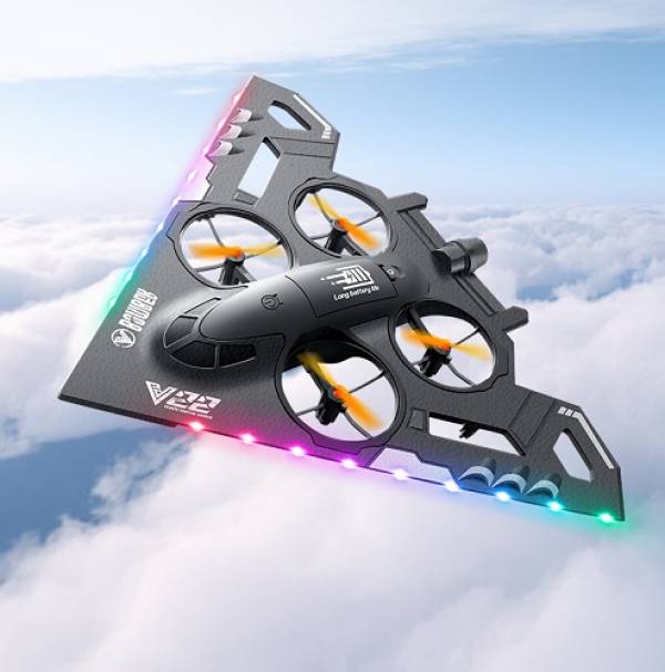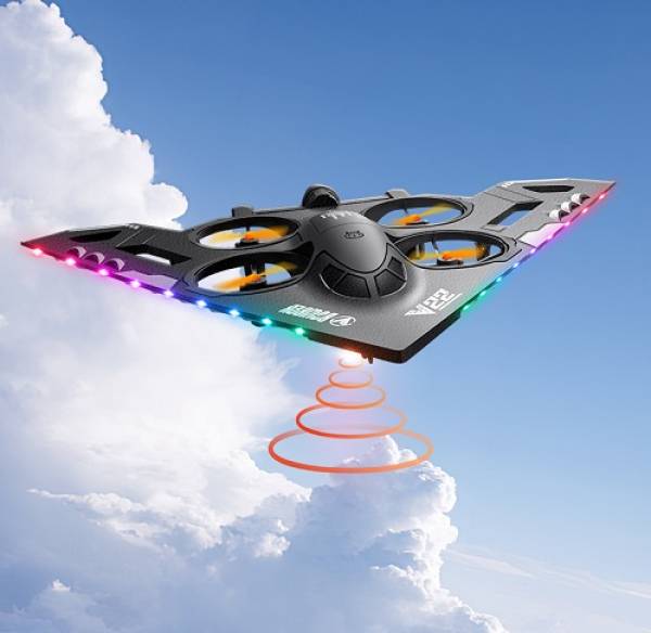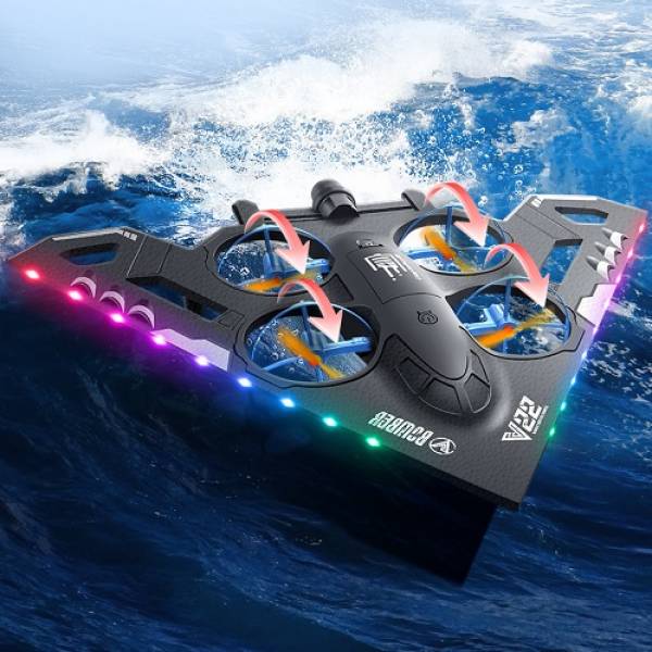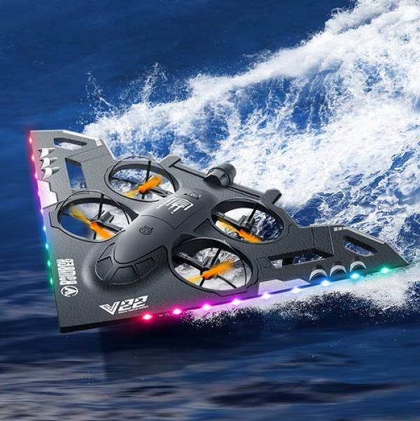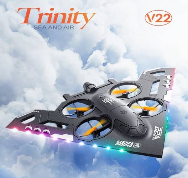 Радиоуправляемый дрон V22 представляет собой четырехосный беспилотный летательный аппарат с пенопластовым фюзеляжем. Имеет три режима полета на море, земле и воздухе.
