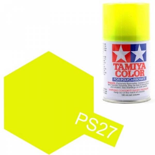 Краска для поликарбоната (лексана) PS-27 (флюоресцентный-желтый) в аэрозольном баллоне для окрашивания кузовов автомоделей. Подходит для большинства типов автомодельных кузовов.