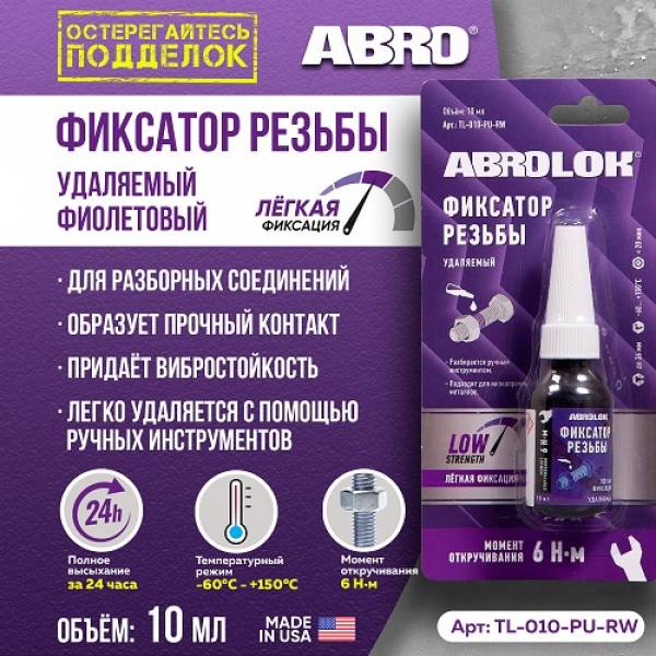 Фиксатор резьбовых соединений фиолетовый ABRO (#TL-010-PU) Удаляемый 10мл — идеальное средство для фиксации резьбовых соединений, не требующих частой разборки. Создает прочное соединение, не теряющее своих свойств со временем. Герметизирует соединение и придает вибростойкость. Устойчиво к большинству химических веществ. Подходит для крепежных деталей диаметром до 36 мм. Высыхает за 20-30 минут на большинстве металлических поверхностей. Полное затвердевание происходит за 24 часа. Температурный режим: -59°C +149°C. Прочность при сдвиге: 3000 psi.